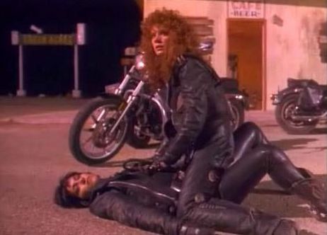 Las mujeres comienzan una pelea en el bar y antes de irse del pueblo, los habitantes las rodean con armas de fuego y un hombre comienza un discurso puritano, antes de poder hacerse con ellas para atarlas una de ellas saca una granada de su bolsillo (algo muy lógico) y los vecinos las dejan montar en sus motos y marcharse. Una de las chicas es la esposa de un hombre del pueblo.